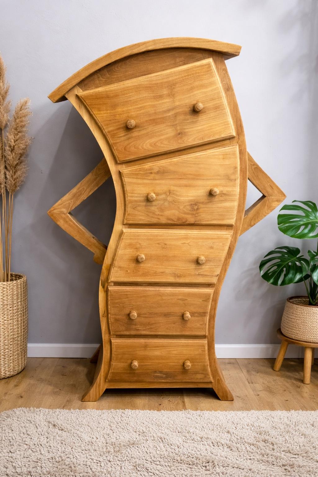Przyciągająca wzrok, nietuzinkowa szafka z naturalnego drewna teak to połączenie funkcjonalności i artystycznej formy. Jej wyjątkowy, falujący kształt sprawia wrażenie ruchu, jakby mebel tańczył w rytmie balijskiego słońca. Projekt „Twist” powstał z inspiracji egzotyką Indonezji i tradycyjnym rzemiosłem wyspy Bali.